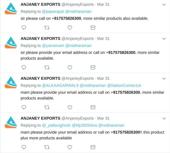 Considering that it is an export agency, we looked for the company Anjaney Exports on Indiamart.com and found the following information.