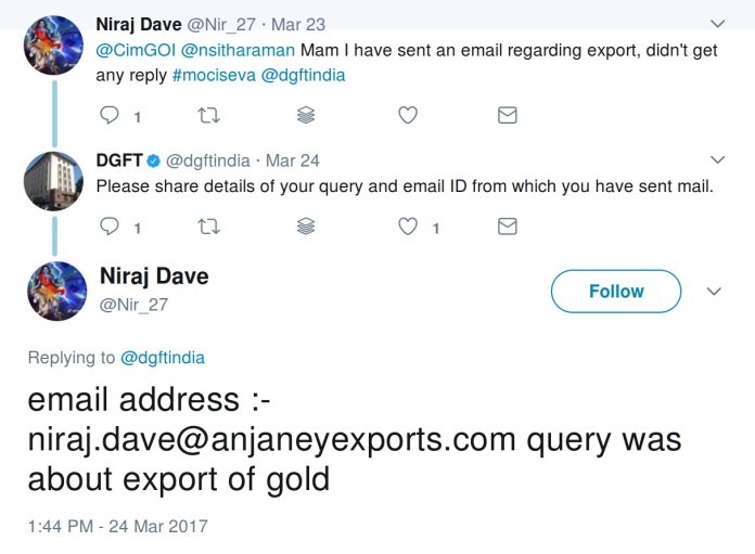 This Truecaller entry also shows that this person’s Twitter handle is “Nir_27”. Again, this is a verified Truecaller profile as indicated by the blue tick mark. Further, a tweet by Nir_27 account confirms that the Niraj Dave handling Anjaney Exports is the same as Niraj Dave handling the Nir_27 Twitter account.