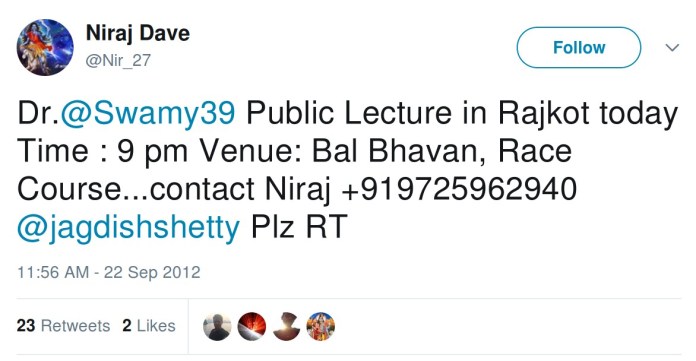 The following 2012 tweet indicates that Dave is also close to other BJP leaders like Subramanian Swamy.