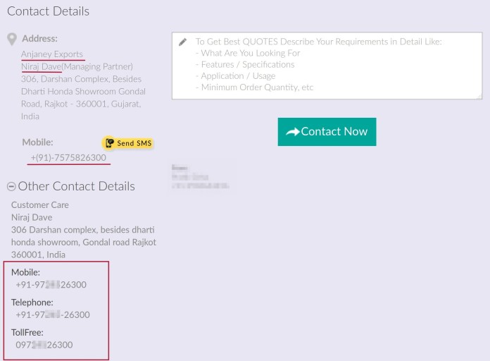 As can be seen in the image above, the number “7575826300” from the WhatsApp account matches the tweets shown earlier from the Anjaney Exports account and also matches the details in this IndiaMart entry. Phone numbers on IndiaMart are verified via OTP (one time password). The names and address have to be put in manually by the entity who wants to be featured in IndiaMart. That would indicate that the Anjaney Exports entry along with the phone numbers and address were manually entered by the person managing the account which in this case would be Niraj Dave whose name is listed as managing partner.