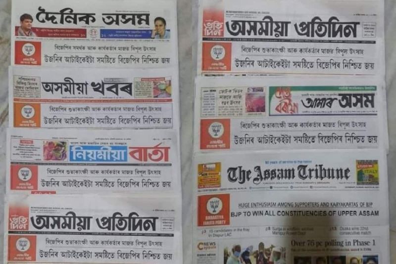 The Congress's Assam unit had filed a complaint against chief minister Sarbananda Sonowal, party president J.P. Nadda and state unit chief Ranjeet Kumar Dass along with eight leading newspapers, which published on Sunday an advertisement in the format of newspaper headlines claiming the party's win in all seats for which polls were held on March 27, 2021. The complaint was filed at the Dispur police station on Sunday night.