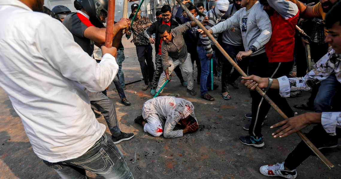 A group of men chanting pro-Hindu slogans, beat Mohammad Zubair, 37, who is Muslim, during protests sparked by a new citizenship law in New Delhi, India. Photo: Reuters/Danish Siddiqui