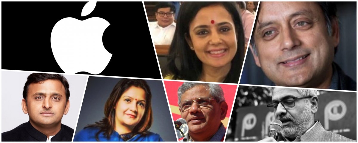 Clockwise from top L: Mahua Moitra, Shashi Tharoor, Siddharth Varadarajan, Sitaram Yechury, Priyanka Chaturvedi, Akhilesh Yadav.