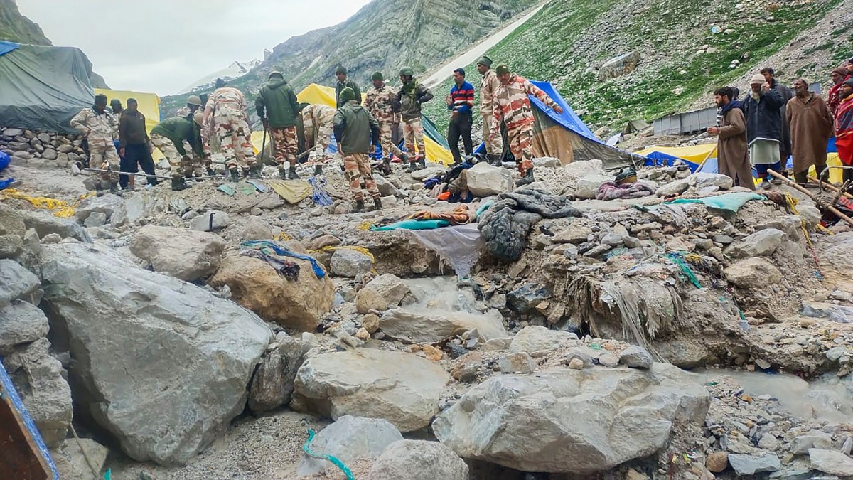 ITBP teams carry out rescue work following flash floods triggered by cloudburst, near the Amarnath cave shrine. Photo: PTI