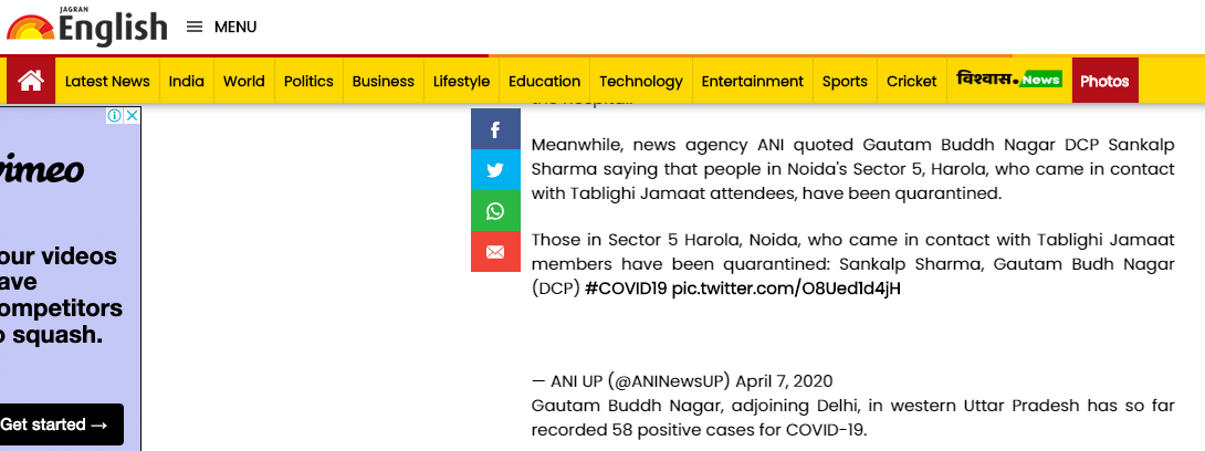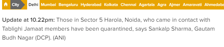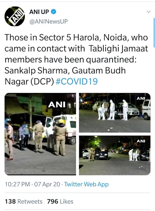 Misinformation regarding COVID-19 has peaked since the Tablighi Jamaat markaz in Delhi’s Nizamuddin emerged as one of the hotspots of the outbreak. On April 7, 2020, news agency ANI tweeted quoting the DCP of Gautam Budh Nagar that those in Sector 5, Harola, Noida who came in contact with Tablighi Jamaat members have been quarantined.