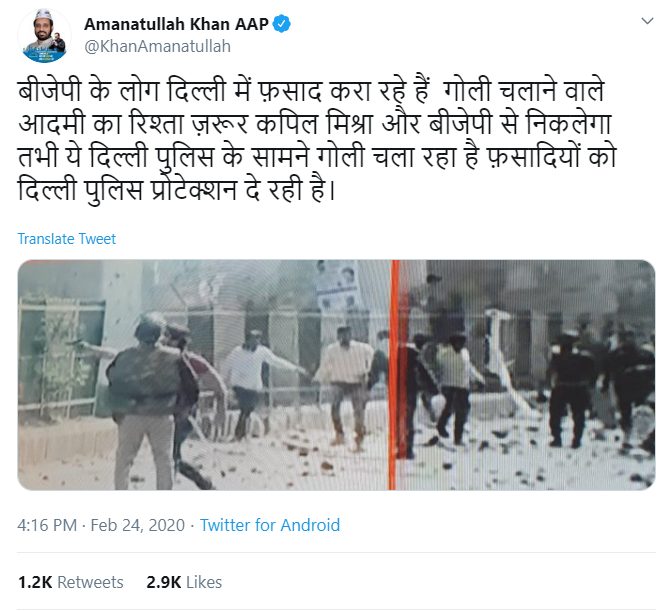 Soon after the incident, Aam Aadmi Party (AAP) MLA Amanatullah Khan tweeted grainy images of the incident and suggested that the shooter is associated with the Bharatiya Janata Party (BJP). He said, “The shooter will definitely have an association with Kapil Mishra and BJP. And that is the reason, he is firing at the Delhi police. The police are giving protection to the rioters (translated)”. The tweet has amassed over 1,000 retweets so far.