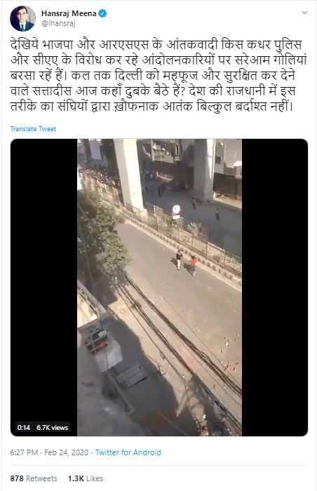Writer-activist Hansraj Meena posted an aerial video of the same incident and said, “Watch the manner in which BJP and RSS terrorist is openly raining bullets at the police at anti-CAA protesters.” He later took down the tweet.