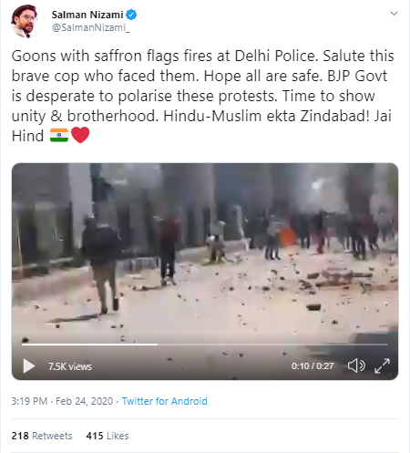 Political figure Salman Nizami too raised allegations against ‘BJP government’ and similarly wrote, “Goons with saffron flags fires at Delhi Police.”