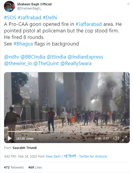 The official handle of Shaheen Bagh tweeted the video shared by Trivedi and asserted that the shooter was a “pro-CAA goon”. This was asserted on the basis of ‘saffron flags’ seen in the background, claimed the handle.
