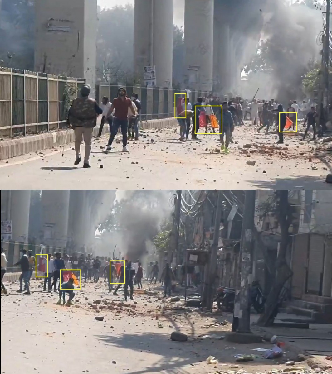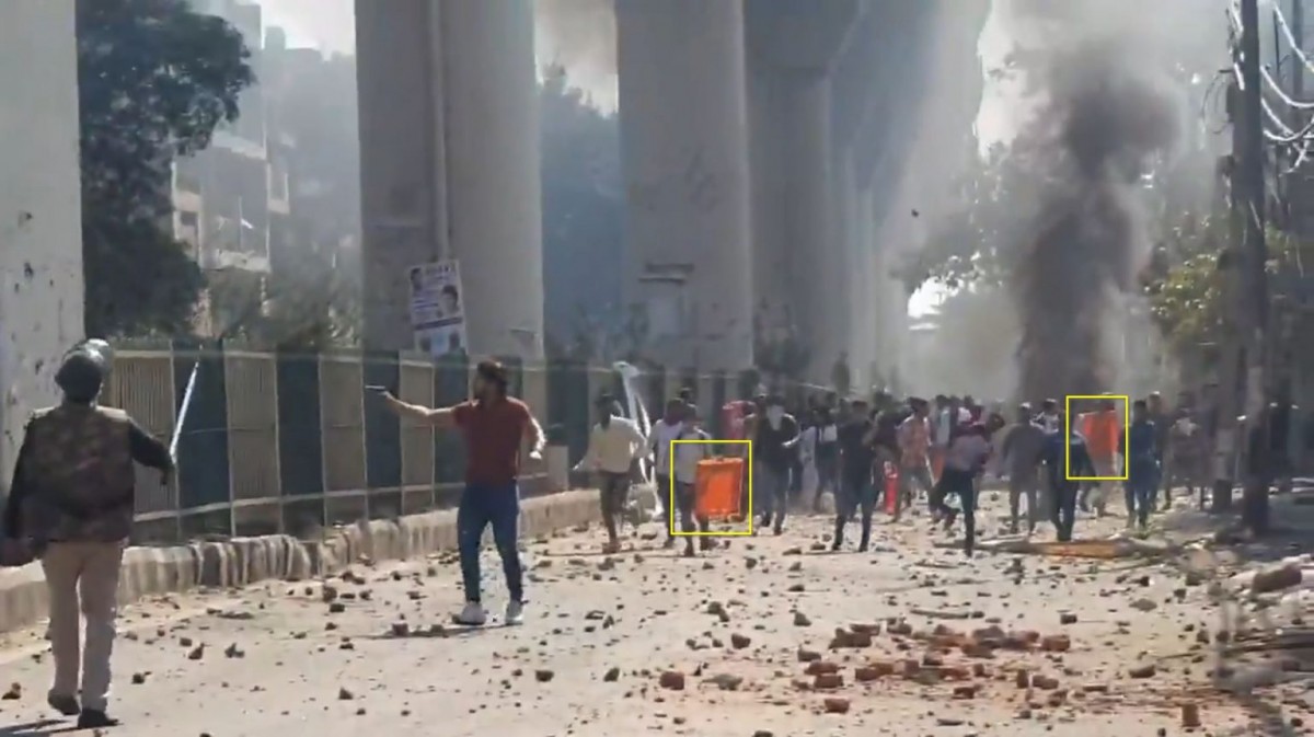 We analysed the videos and found that the protesters were carrying plastic crates, not saffron flags. One can clearly spot the rectangular plastic crates in a screenshot taken from the high-resolution video.