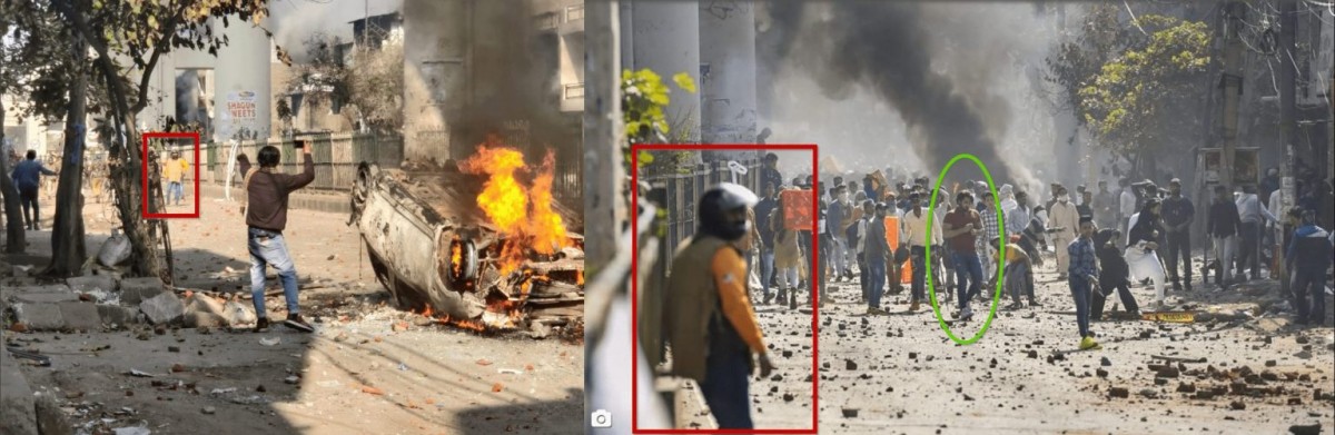 To establish Iyer’s location and verify that the mob pictured by Trivedi and Iyer are the same, we compared a photograph clicked by Iyer with a PTI photo of the same incident. One can spot a policeman dressed in a yellow t-shirt donning a helmet in the images compared below. The cop is facing the anti-CAA protesters. The shooter (highlighted in green) is also visible in the picture.