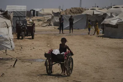 A Palestinian girl pushes a cart loaded with jerrycans of water after collecting it at a camp for displaced people in Khan Younis, Gaza Strip, Wednesday, Aug. 13, 2025. Photo: AP/PTI.