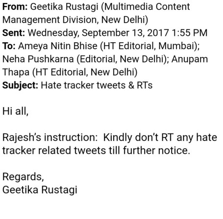 Over the last month, HT has slowly started distancing itself from the hate-tracker. On September 13, 2017, two days after Ghosh’s departure was announced, Geetika Rustagi, the organisation’s content engagement editor, sent an email to editorial heads in Bombay and Delhi with the subject head: “Hate tracker tweets and RTs”.