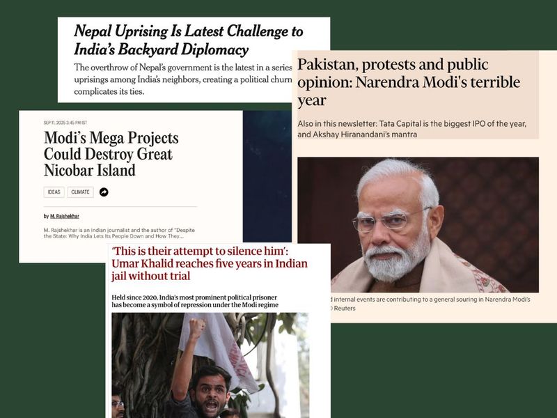 Anupreeta Das and Hari Kumar examine India’s foreign policy ambitions in its “backyard”, in the context of political upheavals in Nepal (2025), Sri Lanka (2022), and Bangladesh (2024). They argue that India risks losing its “traditional sphere of influence” in South Asia, as China steadily expands its presence through infrastructure projects, trade, and political engagement. Michael Kugelman, a South Asia analyst and senior fellow at the Asia Pacific Foundation of Canada, points out that India “can’t afford to be complacent and conclude that neighbors’ negative sentiment toward India is neutralised by their need for Indian support”. Husain Haqqani, former Ambassador of Pakistan to the United States, adds that India’s pursuit of regional dominance, coupled with “the staunch Hindu nationalism of Mr. Modi” and a “jingoistic domestic media”, risks alienating religious groups in South Asian countries.