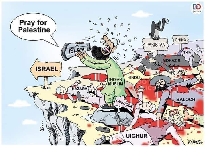 A cartoon of an Indian Muslim man saying, “Pray for Palestine!” over the corpses of Hazaras, Hindus, Balochs and Uighurs in Pakistan and China. Photo: Twitter