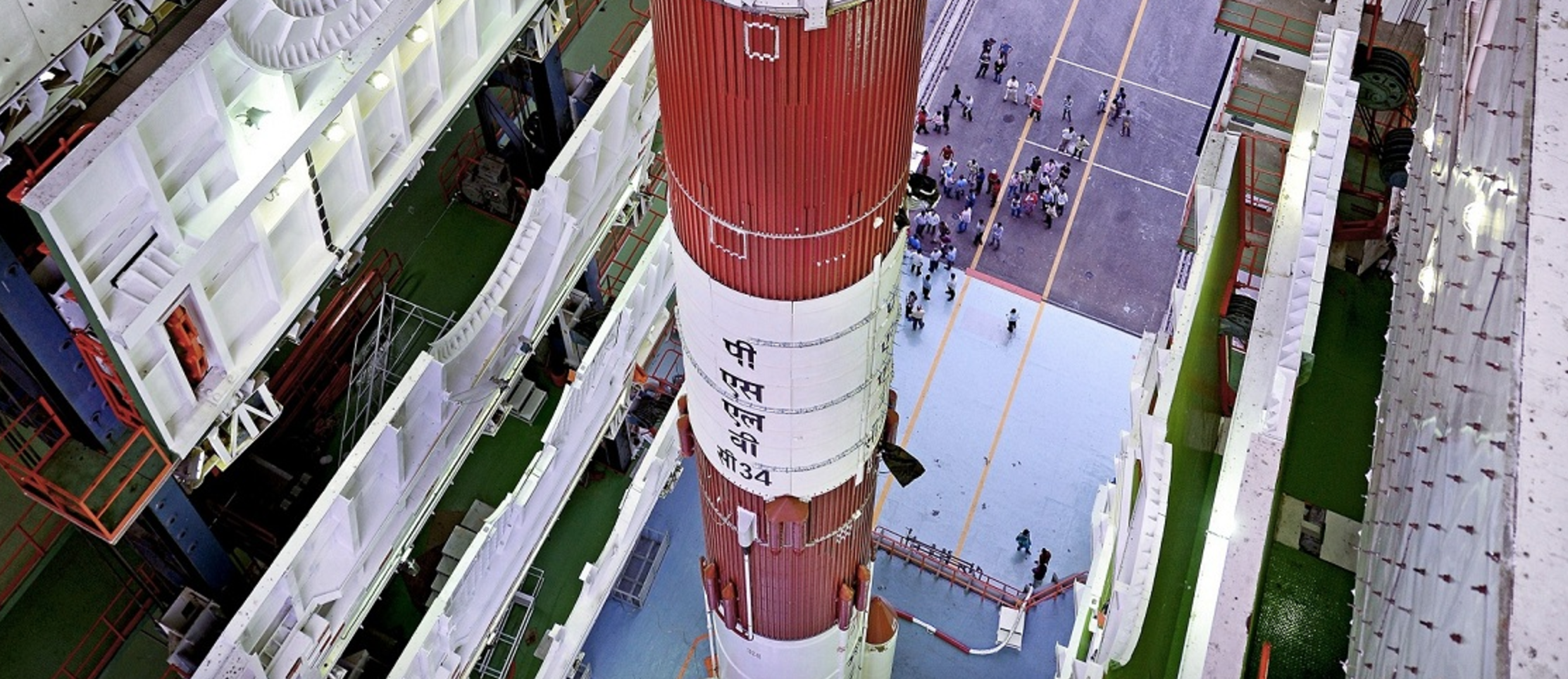 The PSLV C34 rocket in the vehicle assembly building, Sriharikota, with a group of engineers visible near its base. The C34 mission launched the CartoSat 2C satellite. Credit: ISRO