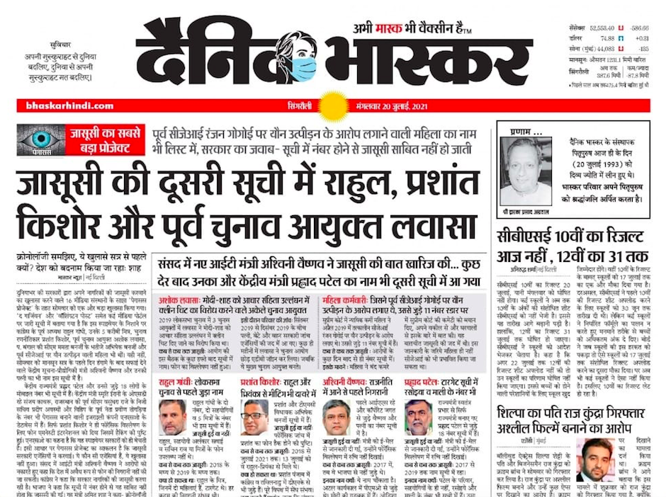 Dainik Bhaskar's frontpage report on the Pegasus Project's findings.