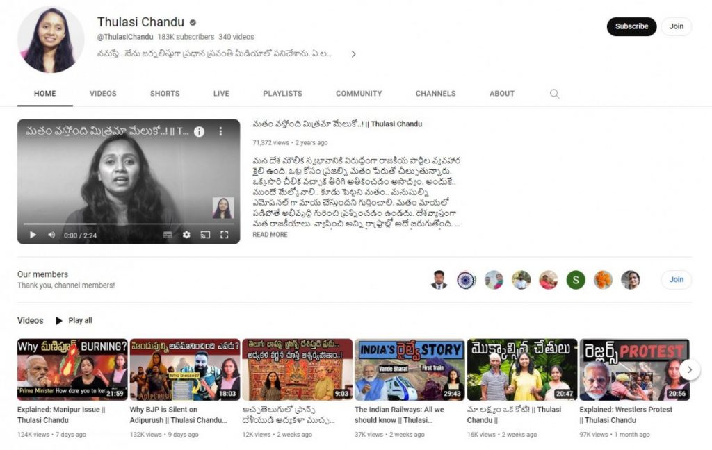 Screenshot of Thulasi Chandu's YouTube channel on June 30, 2023.