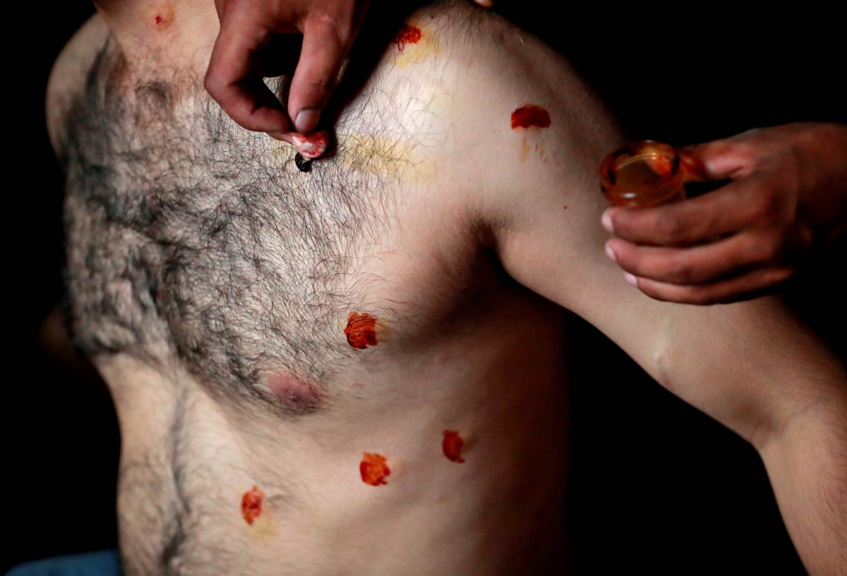 A man with pellet injuries is treated inside a house in a neighbourhood where there have been regular clashes with security forces following restrictions after the government scrapped the special constitutional status for Kashmir, in Srinagar August 14, 2019. Photo: Reuters/Danish Ismail