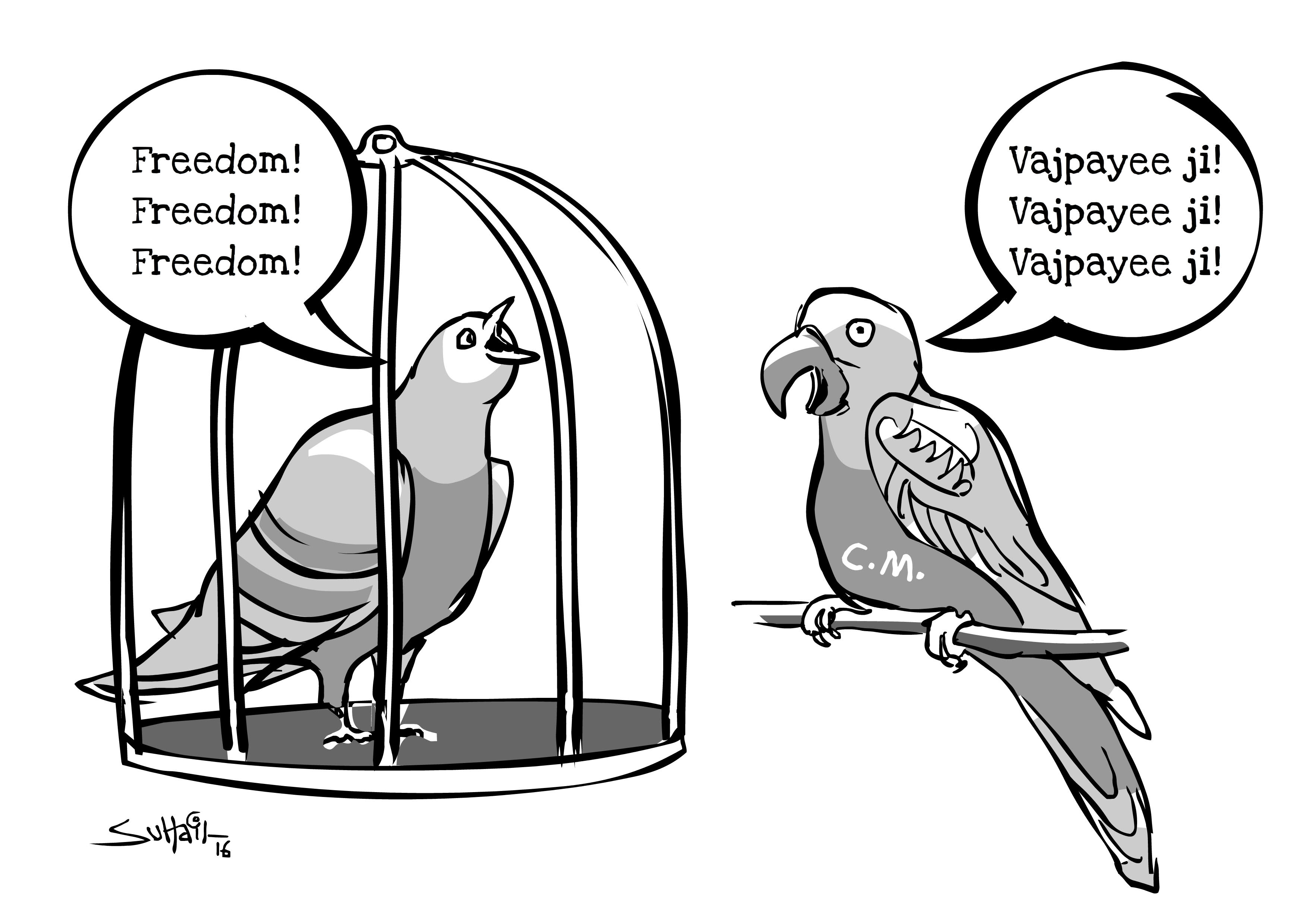 In another cartoon made on a similar theme, the cartoonist showed a caged bird repeatedly saying ‘freedom!’, while Mehbooba Mufti parrots 'Vajpayee ji!' in reply.