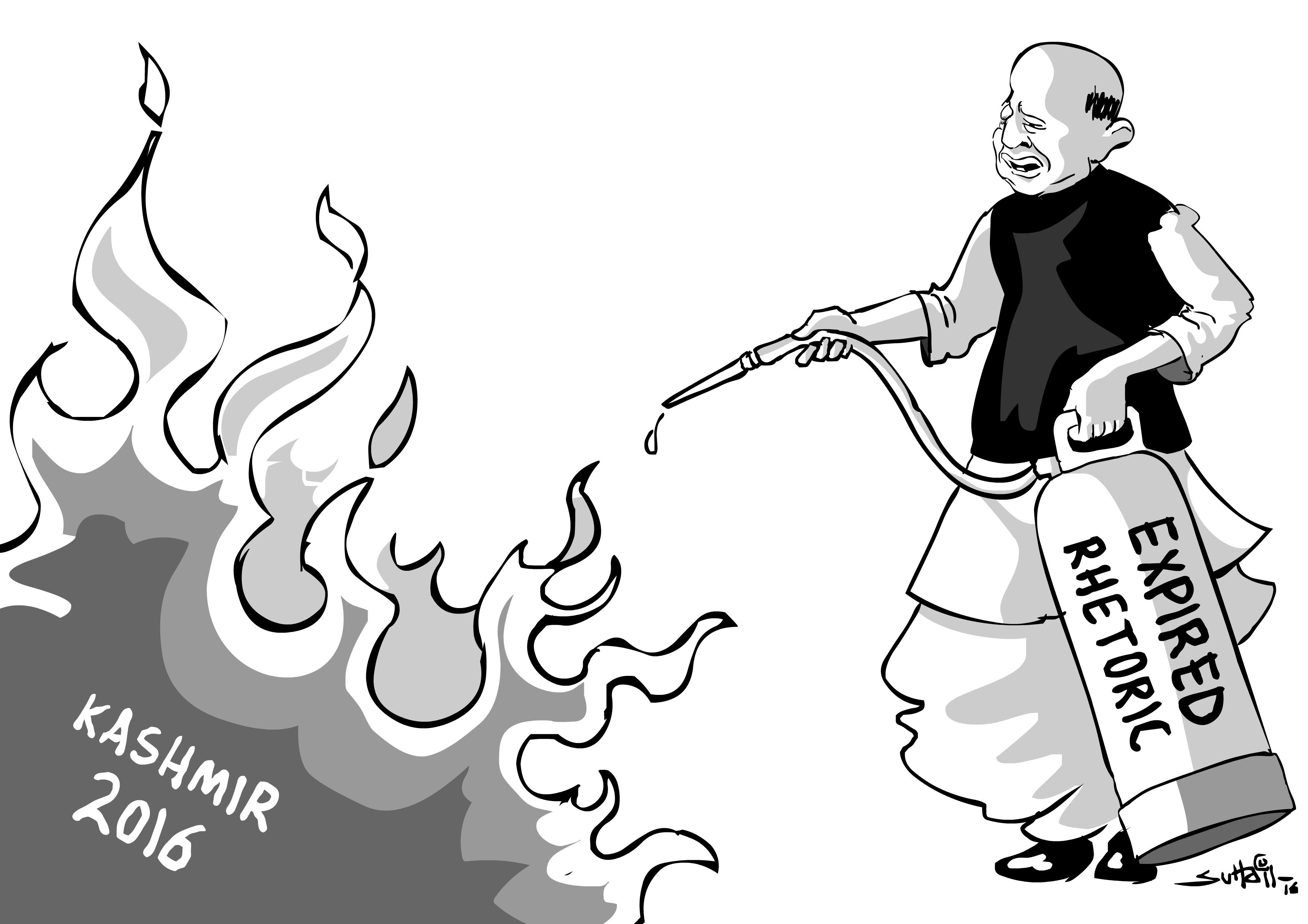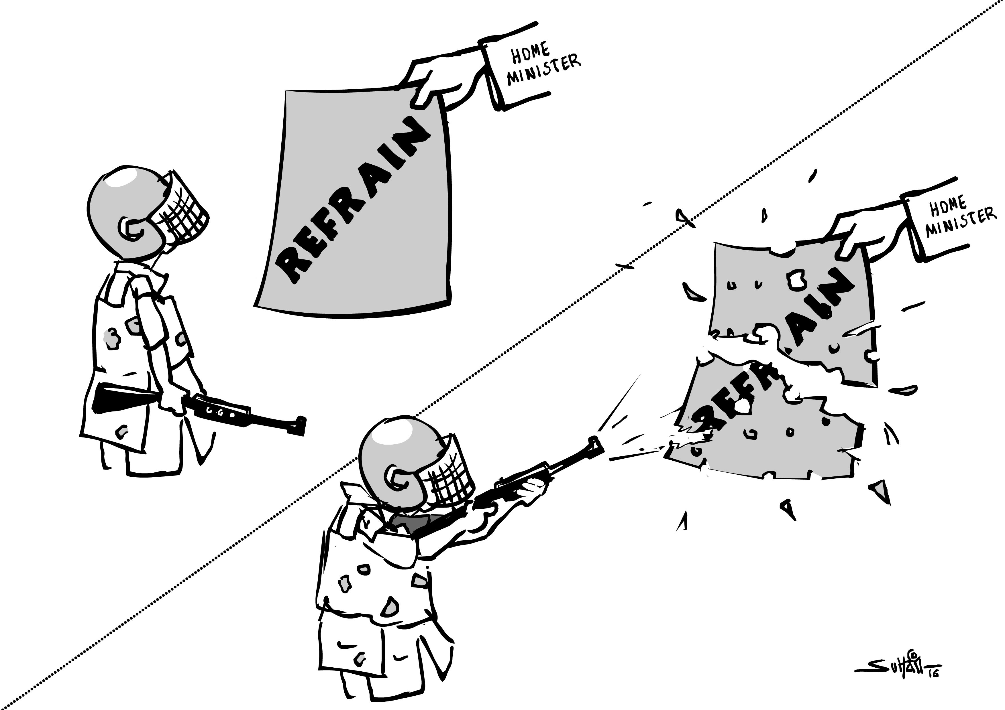 One of his cartoons mocks Rajnath Singh’s 'restraint' talk in Srinagar, in which he urged the paramilitary forces to refrain from using pellet guns. “Despite the home minister asking the paramilitary to refrain from using pellet guns, they continue to be used here with impunity,” he says. “In fact, the same day when Rajnath returned to Delhi, pellet guns were used again, against protesters here.”