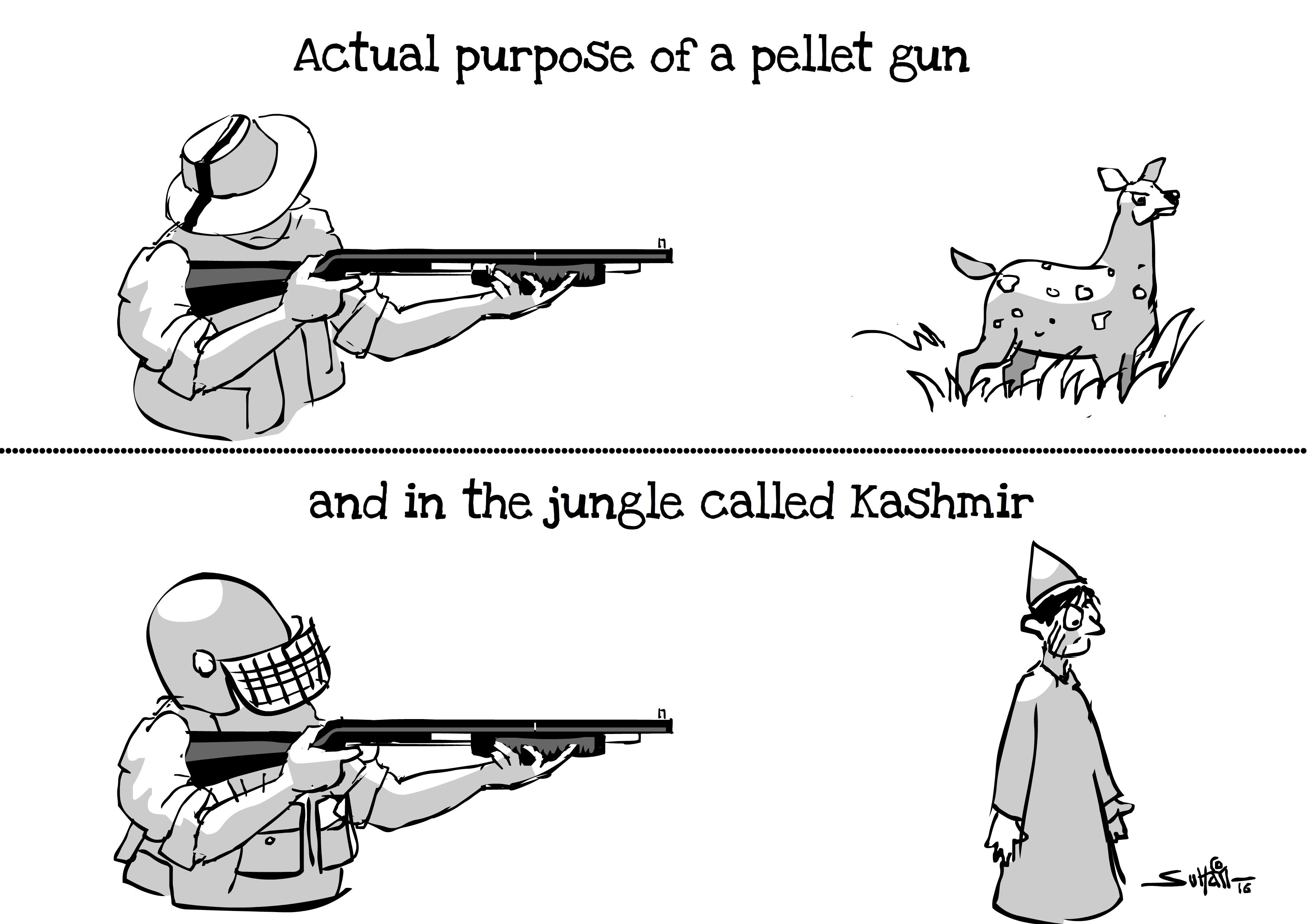 Another popular Kashmir-based cartoonist, Mir Suhail, also came up with powerful cartoons and graphic artwork reflecting the suffering of the people and the pain of youngsters and children blinded by pellets for the past month.
