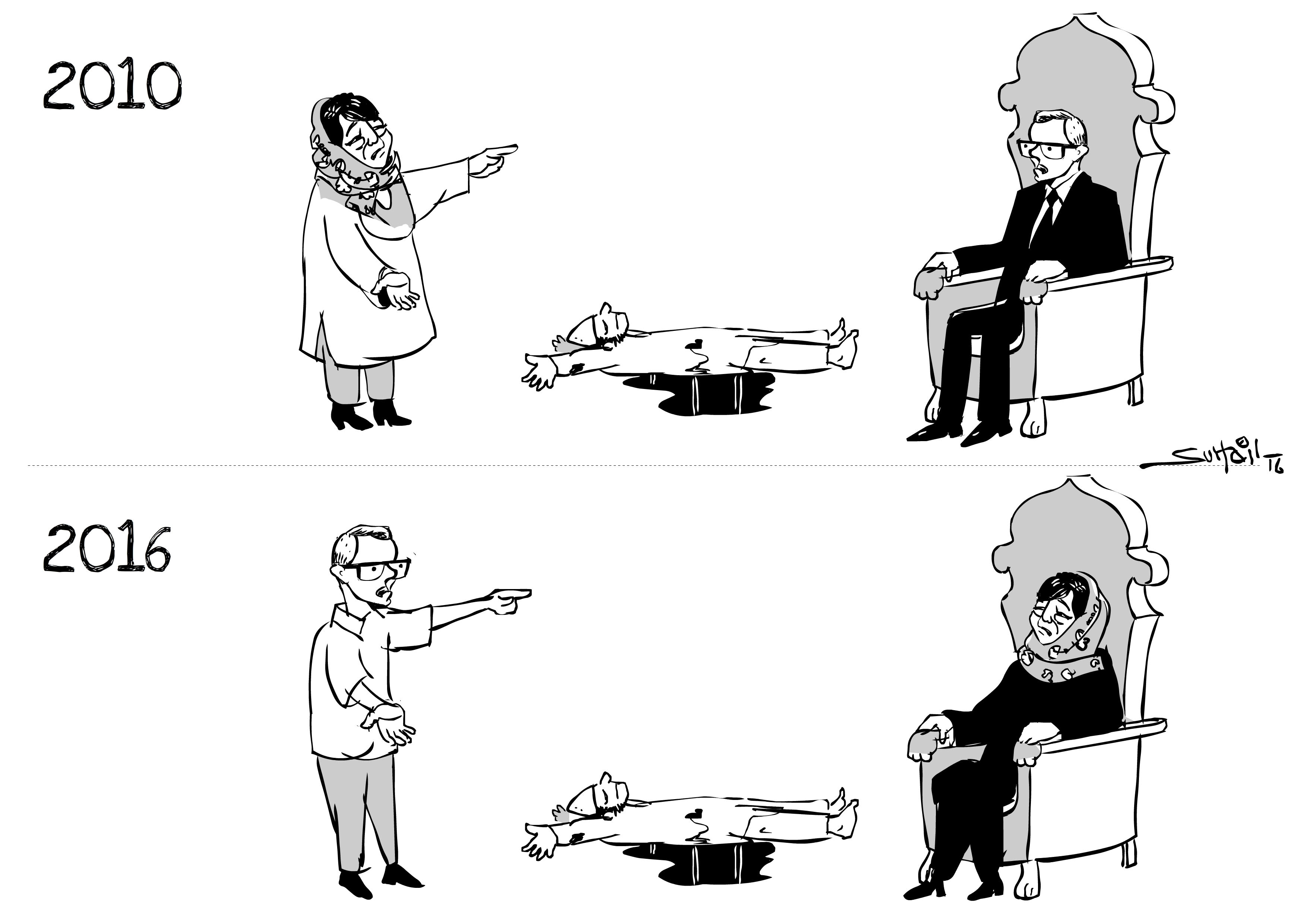 Another popular cartoon he made shows the ex-chief minister, Omar Abdullah, and the present chief minister with a dead man lying in front of them, alternately accusing each other of killing people in 2010 and 2016 civil uprising.