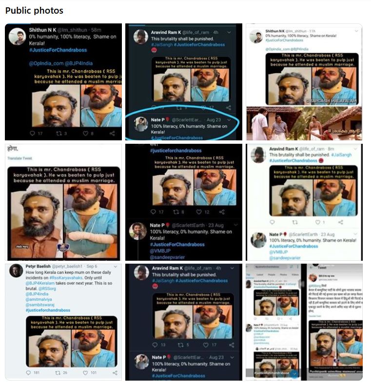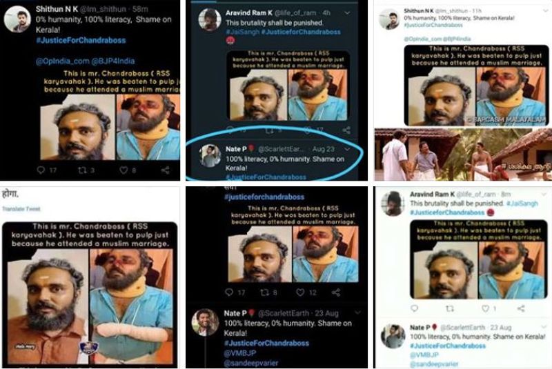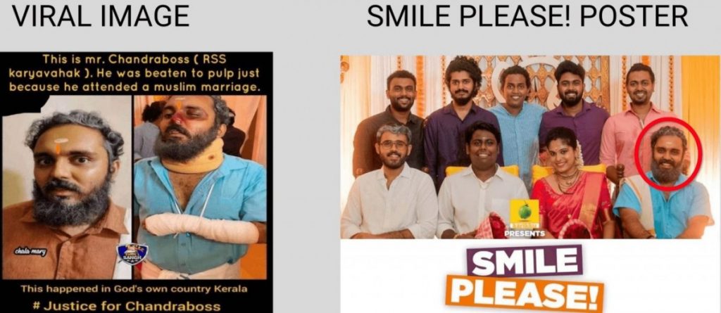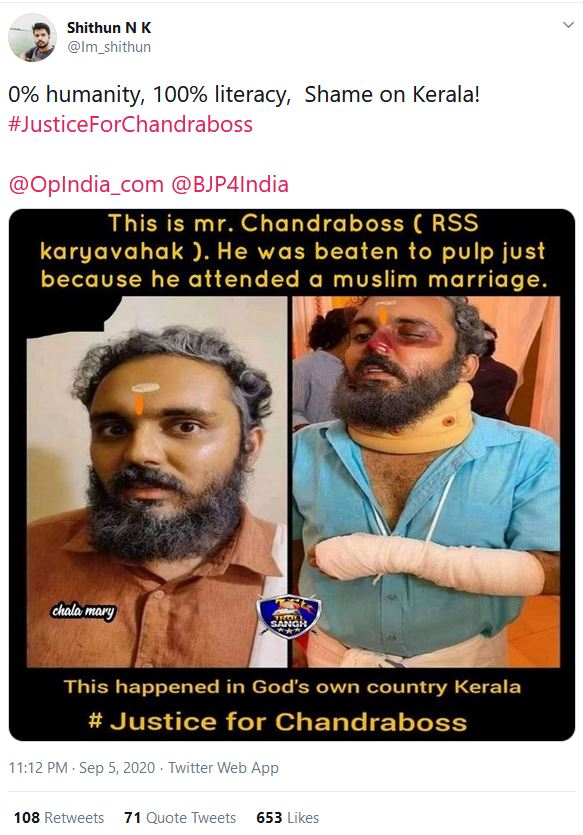 Several Twitter and Facebook users have juxtaposed two images of a man, one of which shows him badly wounded. The text on the image reads, “This is Mr Chandraboss (RSS karyavahak). He was beaten to a pulp just because he attended a Muslim marriage. This happened in God’s own country Kerala.”