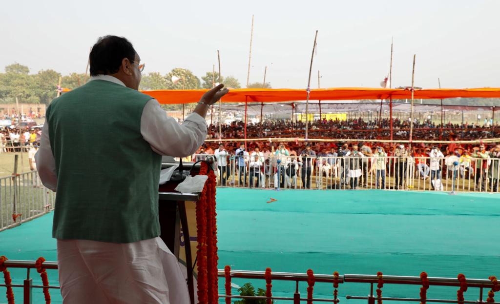 BJP National President J.P. Nadda addressing a public rally at Sahu Jain High School Ground, Lauriya (Bihar). Photo: bjp.org