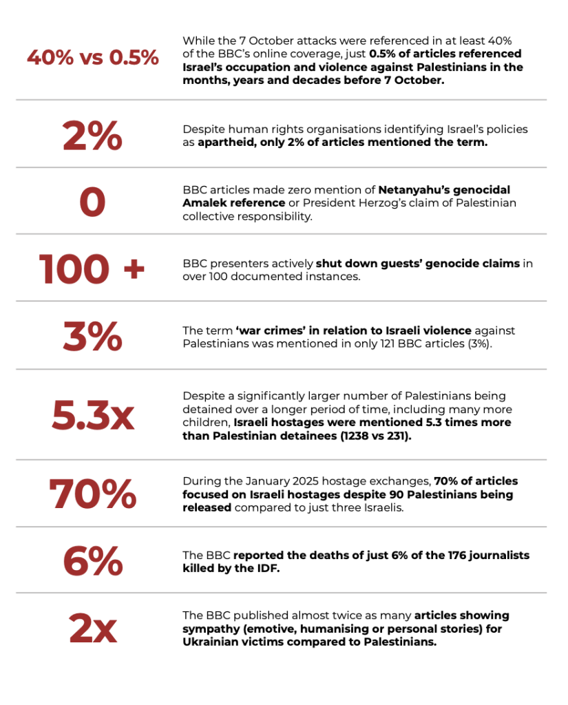 “The evidence clearly suggests that within the BBC’s editorial framework, Palestinian lives simply do not matter equally. In an asymmetric conflict, responsible journalism demands not only neutrality of tone, but rigour in representing the scale and severity of harm – especially to those whose voices are already marginalised in the broader media narrative. The following findings beg the question: does the BBC find Palestinian suffering less newsworthy than Israeli suffering, or is Israeli violence less shocking and newsworthy than Palestinian violence?”