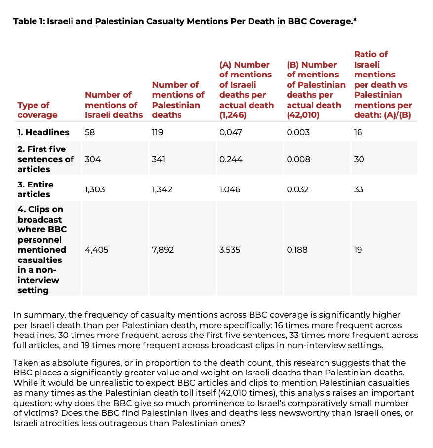 Crucially, the BBC gave Israeli deaths 33 times more coverage across articles, and 19 times more across TV/radio, when measured on a per-fatality basis in proportion to the 34:1 Gazan-Israeli death toll.