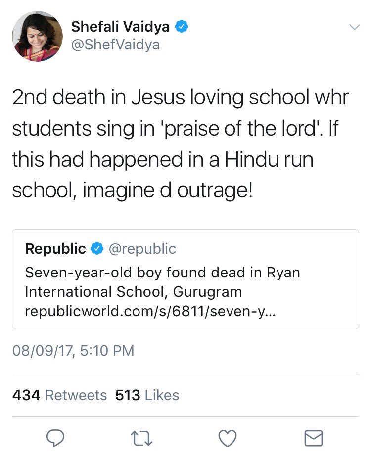 This is the second incident of the Right wing commentariat playing communal politics over murder. Soon after a student of Ryan International School in Delhi was killed allegedly by a school bus conductor, who also tried to sexually assault the boy, Shefali Vaidya, a columnist for Swarajya and who describes herself as a vocal 'Indian Hindu woman', tweeted: