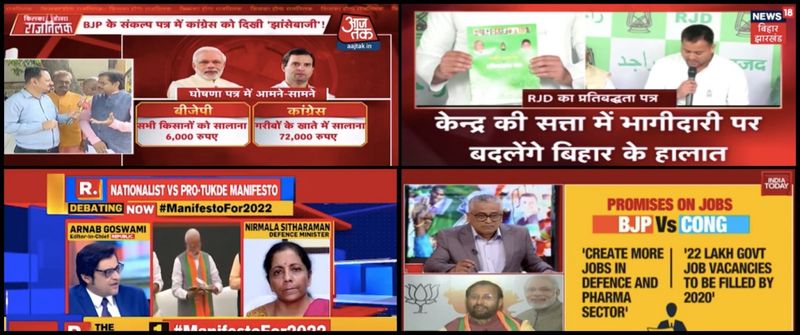 The channel also compared the manifestos of the two parties. BJP has promised more jobs in defence and pharma sectors, annulling Article 370 and Rs 6,000 per annum to farmers; Congress promised 22 lakh government jobs, no change to Article 370 and Rs 72,000 per annum under minimum income scheme.