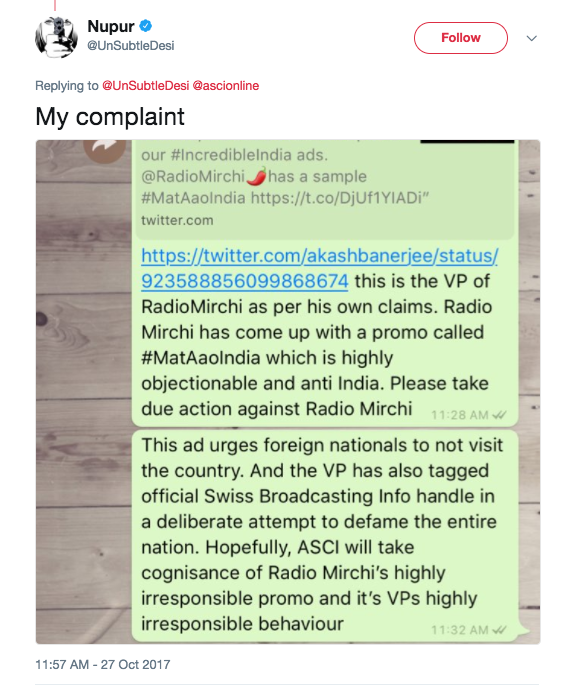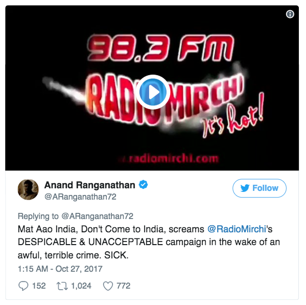According to a report published in a right-wing propaganda website, the Smriti Irani-led I&B ministry has now issued a show-cause notice against Radio Mirchi calling the content "defamatory and violative of [the] AIR code". The notice claims that by "discouraging foreign tourists from visiting India" the radio channel has violated All India Radio's program and advertisement code. The FM station has been asked to respond in 15 days on why they should not be penalised. A source at Radio Mirchi told The Wire that they still haven't received the notice.