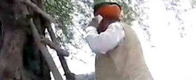 MoS Arjun Ram Meghwal climbs tree to make a call. Credit: Twitter/ANI
