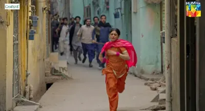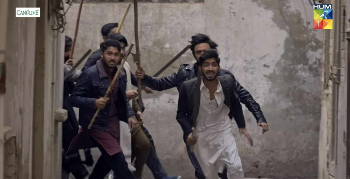 A scene from Tan Man Neelo Neel's finale where a mob holding sticks and makeshift weapons descends on the two lead characters. Screenshot HUM TV