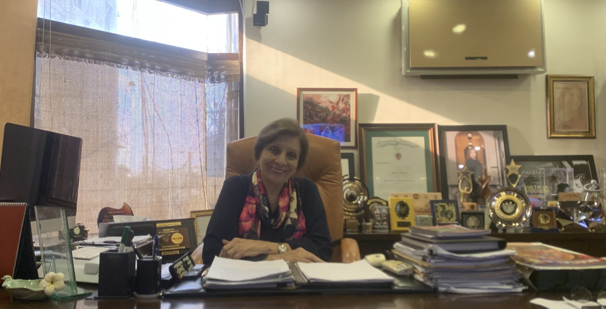 Sultana Siddiqui seated at her office table in Karachi. Photo by Abdullah Zahid.