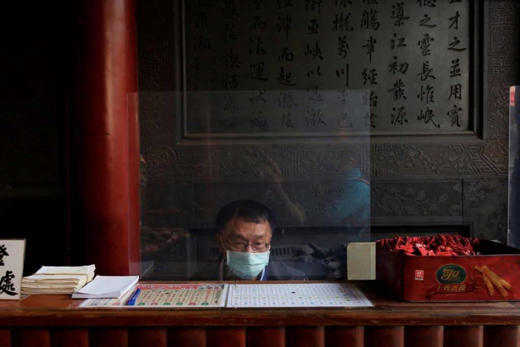 A staff wearing a face mask sits behind a plastic divider to protect himself from the coronavirus disease (COVID-19) at Chaotian Temple in Beigang, Yunlin, Taiwan on April 15, 2020. Photo: Reuters/Ann Wang