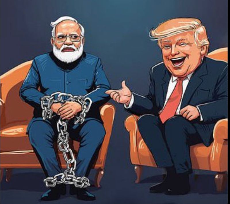Prime Minister Narendra Modi sitting shackled next to US President Donald Trump. Photo: X/@anusharavi10