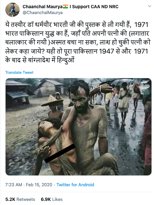 An image of a man carrying a woman whose clothes are torn has gone viral on social media. According to the accompanying message, the photo is from late poet and author Dr Dharamvir Bharti’s book. The image is claimed to capture a scene from the 1971 India-Pakistan war where a husband is carrying his wife who was raped multiple times. The message ends with the claim that the photo depicts the oppression of Hindus in Pakistan and Bangladesh.