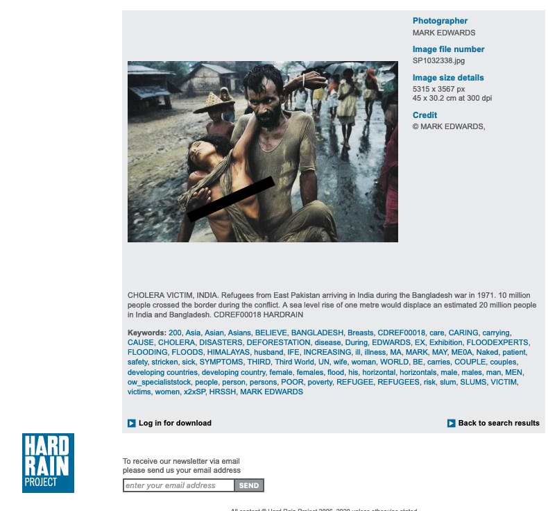 After performing a keyword search, Alt News found the viral image on the website of Hard Rain Project, a charity founded by Edwards. The image was clicked by the photographer himself and it is described as, “Refugees from East Pakistan arriving in India during the Bangladesh war in 1971.