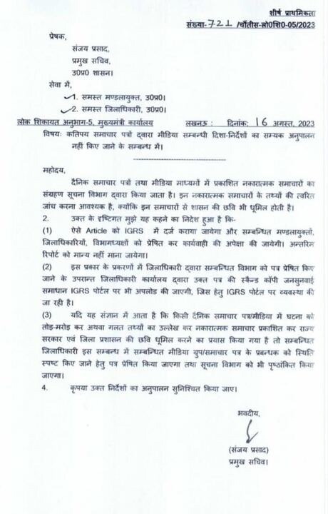 “If it comes to your notice that any daily newspaper or media house publishes negative news on the basis of twisting facts of an event or falsifying information and attempts to tarnish the image of the state government or district administration, the concerned district magistrate must send a letter to the manager of the newspaper or media house asking for a clarification…,” said the order.