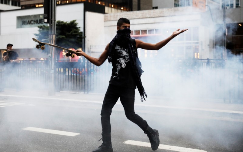 A man gestures riot police after clashing with them during a protest against President Michel Temer's proposed economic reforms in Sao Paulo, Brazil, June 30, 2017. Credit: Reuters/Nacho Doce