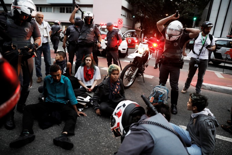 Demonstrators are detained by riot police during a protest against President Michel Temer's proposed economic reforms in Sao Paulo, Brazil, June 30, 2017. Credit: Reuters/Nacho Doce