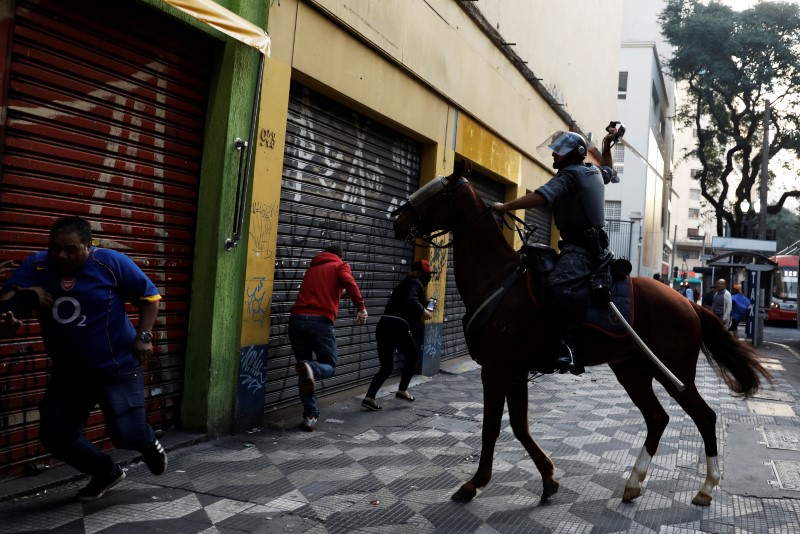 Riot police, holding a sword, clash with members of Brazil's Movimento dos Sem-Teto (Roofless Movement) during a protest against President Michel Temer's proposed economic reforms in Sao Paulo, Brazil June 30, 2017. Credit: Reuters/Nacho Doce