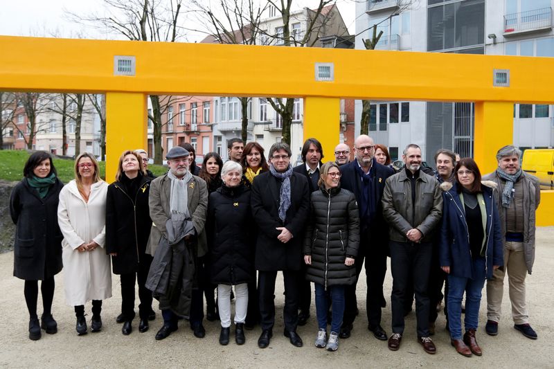 Former Catalan leader Carles Puigdemont poses with members of his party 'Junts per Catalunya' parliament group in Brussels, Belgium January 12, 2018. Credit: Reuters/Francois Lenoir