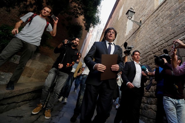 Catalan President Carles Puigdemont is surrounded by media as he leaves the regional government headquarters after delivering a statement in Barcelona, Spain, October 26, 2017. Credit: Reuters/Yves Herman