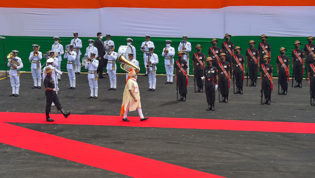Prime Minister Narendra Modi inspects the Guard of Honour during the 74th Independence Day celebrations, at Red Fort in New Delhi, August 15 2020. Photo: PTI