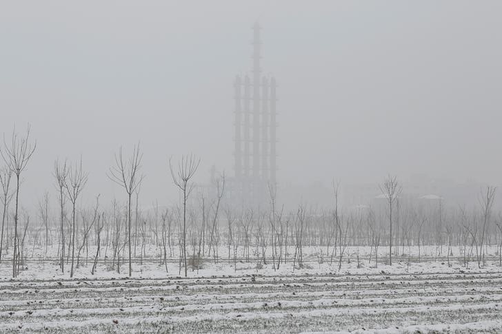 A plant inside the Guantao Chemical Industry Park is seen behind farmland near the village of East Luzhuang, Hebei province, February 22, 2017. Picture taken February 22, 2017. Credit: Reuters/Thomas Peter