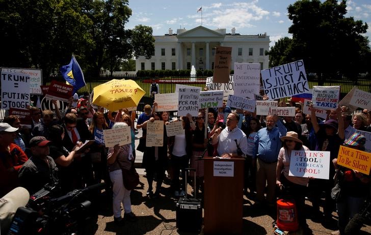 Protesters gather to rally against US President Donald Trump's firing of Federal Bureau of Investigation (FBI) Director James Comey, outside the White House in Washington, US May 10, 2017. Credit: Reuters/Jonathan Ernst